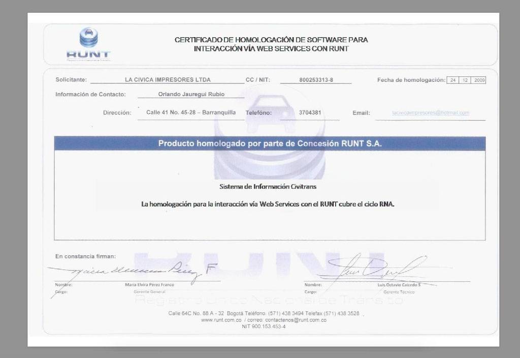 La Cívica Impresores S.A.S. cumple con la homologación desde el año 2009 y los requisitos establecidos en la resolución 792 del 2013, expedida por el Ministerio de Transporte para el proceso de certificación y recertificación de los servicios web, cuyo alcance es: